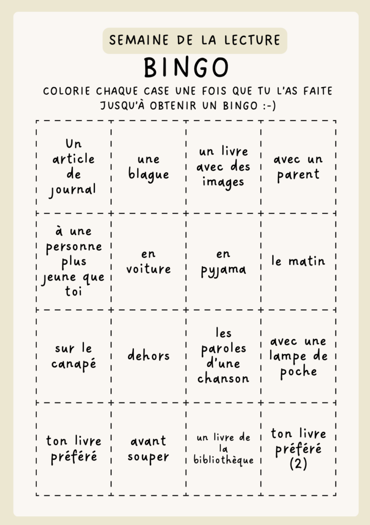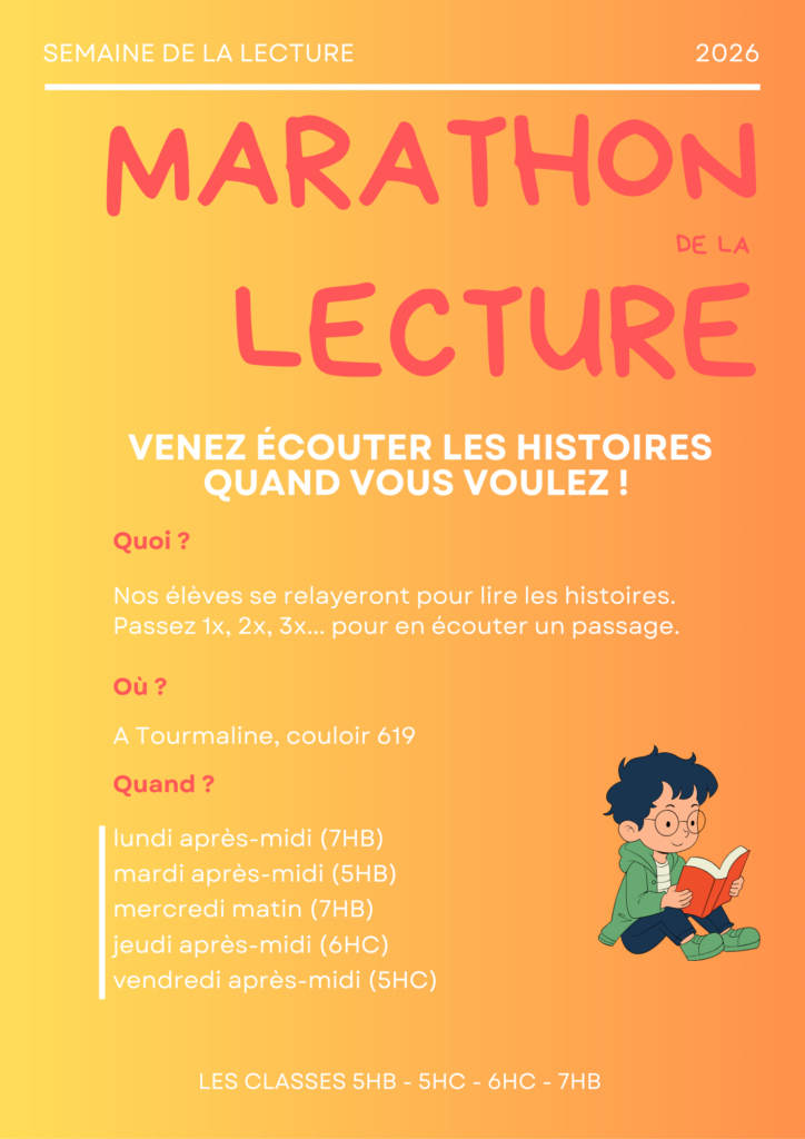 Pour la semaine de la lecture en Suisse romande, plusieurs classes de 5-6-7H vont vivre des expériences en lecture. Certains participeront à un marathon en tant que lecteurs et se relayeront durant la semaine pour lire des histoires à haute voix non stop. Dans plusieurs classes du cycle 2, il y a également comme unique devoir cette semaine « lire des livres » sous forme de bingo de la lecture.